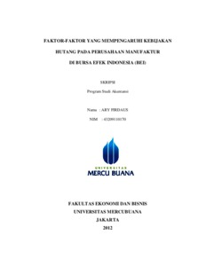 FIRDAUS, ARY (2012) FAKTOR-FAKTOR YANG MEMPENGARUHI KEBIJAKAN HUTANG PADA PERUSAHAAN MANUFAKTUR DI BURSA EFEK INDONESIA (BEI). S1 thesis, Universitas Mercu Buana Jakarta.