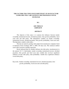 The objective of this study is to analysis the influence between insider ownership, institutional investor, dividend payments, firm growth, profitability, fixed asset ratio and debt policy. The independent variables are insider ownership, institutional investor, dividend payments, firm growth, profitability, fixed asset ratio. The dependent variable is debt policy. The data are taken by pooling with sample from manufacture companies listed in Indonesia Stock Exchange 2007 to 2009; 105 data exist. The statistical method used in this research is multiple regression. Result indicated that all variables influence the debt policy simultaneously in the amount 18.3 %. Individually, insider ownership, institutional investor, dividend payments, firm growth, and fixed asset ratio variable does not have significant influence towards debt policy, then profitability variable have significant influence toward debt policy.