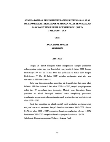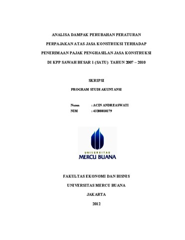 ANDREASWATI, ACIN (2012) ANALISA DAMPAK PERUBAHAN PERATURAN PERPAJAKAN ATAS JASA KONSTRUKSI TERHADAP PENERIMAAN PAJAK PENGHASILAN JASA KONSTRUKSI DI KPP SAWAH BESAR 1 (SATU) TAHUN 2007 – 2010. S1 thesis, Universitas Mercu Buana Jakarta.