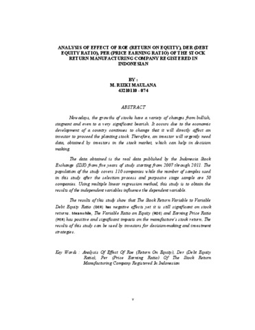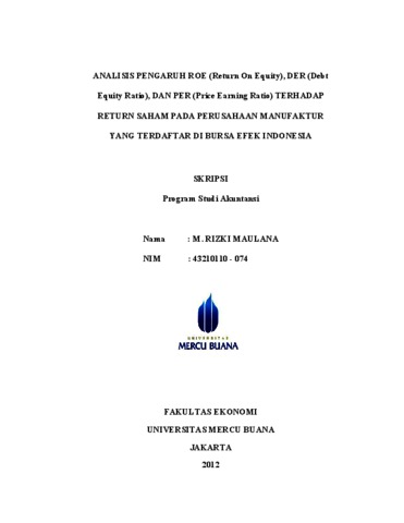 MAULANA, MUHAMMAD RIZKI (2012) ANALISIS PENGARUH ROE (Return On Equity), DER (Debt Equity Ratio), DAN PER (Price Earning Ratio) TERHADAP RETURN SAHAM PADA PERUSAHAAN MANUFAKTUR YANG TERDAFTAR DI BURSA EFEK INDONESIA. S1 thesis, Universitas Mercu Buana Jakarta.