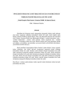 Penelitian ini bertujuan untuk menganalisa pengaruh struktur audit mekanis dan kultur organisasi terhadap komunikasi dalam tim audit (studi empiris pada Kantor Akuntan Publik di Jakarta Barat). Data yang diperoleh sebanyak 40 responden dari 8 Kantor Akuntan Publik dan dihubungkan dengan 2 variabel penelitian, yaitu : variabel independen : struktur audit mekanis, kultur organisasi dan variabel dependen : komunikasi dalam tim audit. Metode analisis data yang digunakan adalah uji validitas, uji reabilitas, uji normalitas, uji asumsi klasik, uji koefisien determinasi, uji koefisien korelasi dan uji t. Hasil penelitian menunjukkan bahwa Struktur audit mekanis, kultur suportif, kultur birokratis, dan kultur inovatif mempunyai pengaruh positif terhadap komunikasi dalam tim audit. Struktur audit mekanis dengan komunikasi tim audit tidak mempunyai pengaruh terhadap komunikasi dalam tim audit. Kultur birokratis dengan komunikasi tim audit tidak mempunyai pengaruh terhadap komunikasi dalam tim audit. Kultur inovatif dengan komunikasi tim audit tidak mempunyai pengaruh terhadap komunikasi dalam tim audit. Kultur suportif dengan komunikasi tim audit mempunyai pengaruh terhadap komunikasi dalam tim audit.
