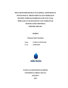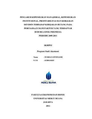 NINGSIH, NURHAYATI (2012) PENGARUH KEPEMILIKAN MANAJERIAL, KEPEMILIKAN INSTITUSIONAL, PROFITABILITAS DAN KEBIJAKAN DEVIDEN TERHADAP KEBIJAKAN HUTANG PADA PERUSAHAAN MANUFAKTUR YANG TERDAFTAR DI BURSA EFEK INDONESIA PERIODE 2009-2011. S1 thesis, Universitas Mercu Buana Jakarta.