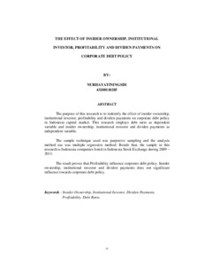 The purpose of this research is to indentify the effect of insider ownership, institutional investor, profitability and dividen payments on corporate debt policy in Indonesia capital market. This research employs debt ratio as dependent variable and insider ownership, institutional investor and dividen payments as independent variable. The sample technique used was purposive sampling and the analysis method use was multiple regression method. Beside that, the sample in this research is Indonesia companies listed in Indonesia Stock Exchange during 2009 – 2011. The result proves that Profitability influence corporate debt policy. Insider ownership, institutional investor and dividen payments does not significant influence towards corporate debt policy.