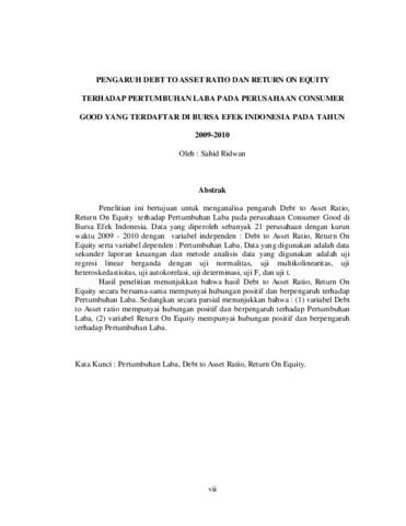 Penelitian ini bertujuan untuk menganalisa pengaruh Debt to Asset Ratio, Return On Equity terhadap Pertumbuhan Laba pada perusahaan Consumer Good di Bursa Efek Indonesia. Data yang diperoleh sebanyak 21 perusahaan dengan kurun waktu 2009 - 2010 dengan variabel independen : Debt to Asset Ratio, Return On Equity serta variabel dependen : Pertumbuhan Laba. Data yang digunakan adalah data sekunder laporan keuangan dan metode analisis data yang digunakan adalah uji regresi linear berganda dengan uji normalitas, uji multikolinearitas, uji heteroskedastisitas, uji autokorelasi, uji determinasi, uji F, dan uji t. Hasil penelitian menunjukkan bahwa hasil Debt to Asset Ratio, Return On Equity secara bersama-sama mempunyai hubungan positif dan berpengaruh terhadap Pertumbuhan Laba. Sedangkan secara parsial menunjukkan bahwa : (1) variabel Debt to Asset ratio mempunyai hubungan positif dan berpengaruh terhadap Pertumbuhan Laba, (2) variabel Return On Equity mempunyai hubungan positif dan berpengaruh terhadap Pertumbuhan Laba