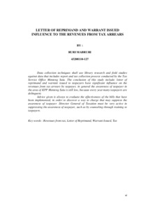 Data collection techniques shall use library research and field studies against data that includes report and tax collection process conducted by the Tax Service Office Menteng Satu. The conclusion of this study include: letter of reprimand and warrant issued to taxpayers have significant influence on the revenues from tax arrears by taxpayer, in general the awareness of taxpayer in the area of KPP Menteng Satu is still low, because every year many taxpayers are delinquent. Advice given is always to evaluate the effectiveness of the bills that have been implemented, in order to discover a way to charge that may suppress the awareness of taxpayer. Director General of Taxation must be very active in suppressing the awareness of taxpayer, such as by counseling through training to taxpayers.