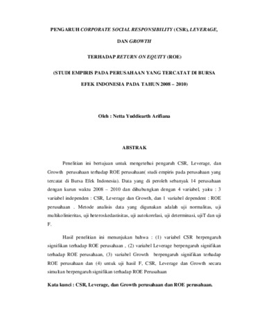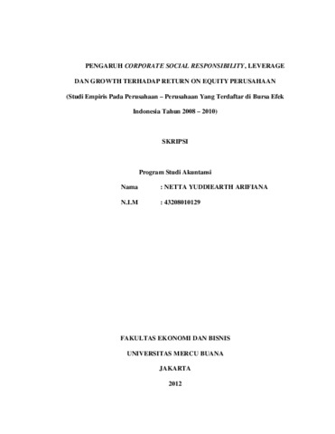 ARIFIANA, NETTA YUDDIEARTH (2012) PENGARUH CORPORATE SOCIAL RESPONSIBILITY, LEVERAGE DAN GROWTH TERHADAP RETURN ON EQUITY PERUSAHAAN (Studi Empiris Pada Perusahaan – Perusahaan Yang Terdaftar di Bursa Efek Indonesia Tahun 2008 – 2010). S1 thesis, Universitas Mercu Buana Jakarta.