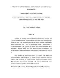 enelitian ini bertujuan untuk mengetehui pengaruh CSR, Leverage, dan Growth perusahaan terhadap ROE perusahaan( studi empiris pada perusahaan yang tercatat di Bursa Efek Indonesia). Data yang di peroleh sebanyak 14 perusahaan dengan kurun waktu 2008 – 2010 dan dihubungkan dengan 4 variabel, yaitu : 3 variabel independen : CSR, Leverage dan Growth, dan 1 variabel dependent : ROE perusahaan . Metode analisis data yang digunakan adalah uji normalitas, uji multikolinieritas, uji heteroskedastisitas, uji autokorelasi, uji determinasi, ujiT dan uji F. Hasil penelitian ini menunjukan bahwa : (1) variabel CSR berpengaruh signifikan terhadap ROE perusahaan , (2) variabel Leverage berpengaruh signifikan terhadap ROE perusahaan, (3) variabel Growth berpengaruh signifikan terhadap ROE perusahaan dan (4) untuk uji hasil F, CSR, Leverage dan Growth secara simultan berpengaruh signifikan terhadap ROE Perusahaan