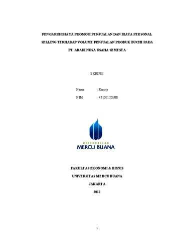 RONNY, RONNY (2012) PENGARUH BIAYA PROMOSI PENJUALAN DAN BIAYA PERSONAL SELLING TERHADAP VOLUME PENJUALAN PRODUK BUCHI PADA PT. ABADI NUSA USAHA SEMESTA. S1 thesis, Universitas Mercu Buana Jakarta.