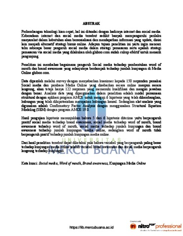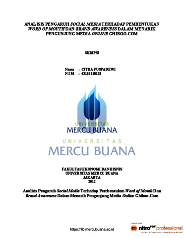 DEWI, CITRA PUSPA (2012) ANALISIS PENGARUH SOSIAL MEDIA TERHADAP PEMBENTUKAN WORD OF MOUTH DAN BRAND AWARENESS DALAM MENARIK PENGUNJUNG MEDIA ONLINE GHIBOO.COM. S1 thesis, Universitas Mercu Buana Jakarta.