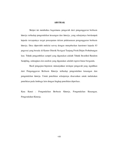 Skripsi ini membahas bagaimana pengaruh dari penganggaran berbasis kinerja terhadap pengendalian keuangan dan kinerja, yang selanjutnya berdampak kepada tercapainya target pencapaian dalam pelaksanaan penganggaran berbasis kinerja. Data diperoleh melalui survey dengan menyebarkan kuesioner kepada 83 pegawai yang berada di Kantor Distrik Navigasi Tanjung Priok Ditjen Perhubungan laut. Teknik pengambilan sampel yang digunakan adalah Teknik Stratified Random Sampling, sedangkan alat analisis yang digunakan adalah regresi linear berganda. Hasil pengujian hipotesis menunjukkan terdapat pengaruh yang signifikan dari Penganggaran Berbasis Kinerja terhadap pengendalian keuangan dan pengendalian kinerja. Untuk penelitian selanjutnya disarankan untuk melakukan penelitian pada lembaga lain dengan lingkup penelitian diperluas