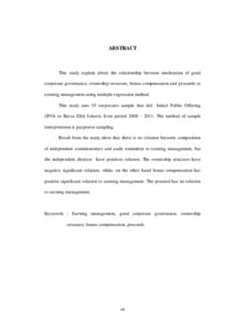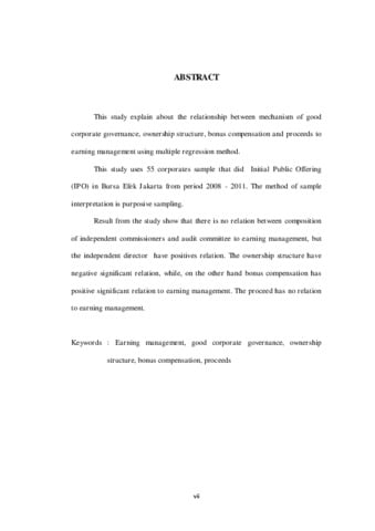 Penelitian ini menjelaskan hubungan antara praktek good corporate governance, struktur kepemilikan, kompensasi bonus dan nilai penawaran saham terhadap manajemen laba dengan menggunakan metode regresi berganda. Penelitian ini menggunakan sampel sebanyak 55 perusahaan yang melakukan penawaran saham perdana (IPO) di Bursa Efek Jakarta dalam periode tahun 2008 – 2011. Metode yang digunakan dalam mendapatkan jumlah sampel tersebut adalah dengan purposive sampling. Hasil penelitian menunjukkan bahwa komposisi komisaris independen dan keberadaan komite audit tidak memiliki pengaruh terhadap manajemen laba, tetapi komposisi dewan direksi memiliki pengaruh. Struktur kepemilikan memiliki hubungan signifikan negative, namun disisi lain pemberian kompensasi bonus memiliki hubungan signifikan positif terhadap manajemen laba. Nilai penawaran saham tidak berpengaruh terhadap manajemen laba.