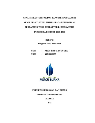 ANGGORO, ARDY BAYU (2012) ANALISIS FAKTOR-FAKTOR YANG MEMPENGARUHI AUDIT DELAY STUDI EMPIRIS PADA PERUSAHAAN PERBANKAN YANG TERDAFTAR DI BURSA EFEK INDONESIA PERIODE 2008-2010. S1 thesis, Universitas Mercu Buana Jakarta.