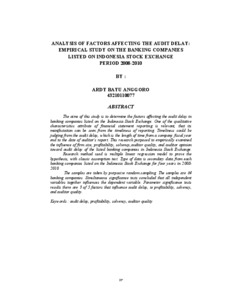 Tujuan penelitian ini adalah untuk mengetahui faktor yang mempengaruhi audit delay pada perusahaan perbankan yang terdaftar di Bursa Efek Indonesia. Salah satu karakteristik kualitatif atribut Laporan keuangan yang relevan, yang manifestasinya dapat dilihat dari ketepatan waktu pelaporan. Ketepatan waktu dapat dilihat dari audit delay, yang merupakan jangka waktu dari akhir tahun fiskal perusahaan dengan tanggal laporan auditor. Penelitian ini bertujuan untuk meneliti secara empiris pengaruh ukuran perusahaan, profitabilitas, solvabilitas, kualitas auditor dan opini auditor terhadap audit delay perusahaan perbankan yang terdaftar di Bursa Efek Indonesia. Metode penelitian yang digunakan adalah model regresi berganda linier untuk membuktikan hipotesis dengan uji asumsi klasik. Jenis data adalah data sekunder dari masing-masing perusahaan perbankan yang terdaftar di Bursa Efek Indonesia selama empat tahun di 2008-2010. Sampel diambil secara random sampling purposive. Sampel yang digunakan adalah 64 perusahaan perbankan. Tes signifikansi simultan menyimpulkan bahwa semua variabel independen bersama-sama mempengaruhi variabel dependen. Tes signifikansi parameter hasil ada 3 dari 5 faktor yang mempengaruhi audit yang delay, yaitu profitabilitas, solvabilitas, dan auditor berkualitas.