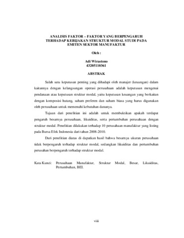 Salah satu keputusan penting yang dihadapi oleh manajer (keuangan) dalam kaitannya dengan kelangsungan operasi perusahaan adalah keputusan mengenai pendanaan atau keputusan struktur modal, yaitu keputusan keuangan yang berkaitan dengan komposisi hutang, saham preferen dan saham biasa yang harus digunakan oleh perusahaan untuk memenuhi kebutuhan dananya. Tujuan dari penelitian ini adalah untuk membuktikan apakah terdapat pengaruh besarnya perusahaan, likuiditas, serta pertumbuhan perusahaan dengan struktur modal. Penelitian dilakukan terhadap 10 perusahaan manufaktur yang listing pada Bursa Efek Indonesia dari tahun 2008-2010. Dari penelitian diatas di dapatkan hasil bahwa besarnya ukuran perusahaan tidak berpengaruh terhadap struktur modal, sedangkan likuiditas dan pertumbuhan perusahan berpengaruh terhadap struktur modal