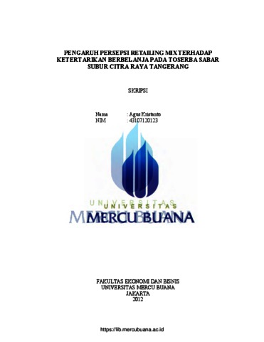 KRISTANTO, AGUS (2012) PENGARUH PERSEPSI RETAILING MIX TERHADAP KETERTARIKAN BERBELANJA PADA TOSERBA SABAR SUBUR CITRA RAYA TANGERANG. S1 thesis, Universitas Mercu Buana Jakarta.