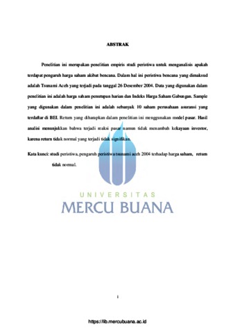 | Uncontrolled Keywords: | studi peristiwa, pengaruh peristiwa tsunami aceh 2004 terhadap harga saham, return tidak normal |