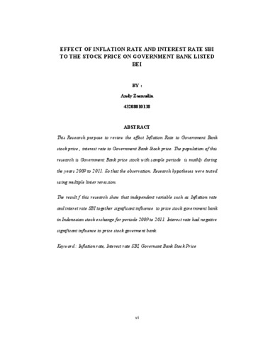 ZAENUDIN, ANDY (2012) PENGARUH TINGKAT INFLASI DAN TINGKAT SUKU BUNGA SBI TERHADAP HARGA SAHAM PADA BANK PEMERINTAH YANG TERDAFTAR DI BEI. S1 thesis, Universitas Mercu Buana Jakarta.