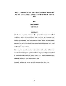 This Research purpose to review the effect Inflation Rate to Government Bank stock price , interest rate to Government Bank Stock price. The population of this research is Government Bank price stock with sample periode is mothly during the years 2009 to 2011. So that the observation. Research hypotheses were tested using multiple linier reression. The result f this research show that independent variable such as Inflation rate and interet rate SBI together significant influence to price stock government bank in Indonesian stock exchange for periode 2009 to 2011. Interest rate had negative significant influence to price stock goverment bank