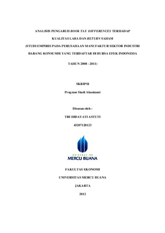 ASTUTI, TRI HIDAYATI (2012) ANALISIS PENGARUH BOOK TAX DIFFERENCES TERHADAP KUALITAS LABA DAN RETURN SAHAM (STUDI EMPIRIS PADA PERUSAHAAN MANUFAKTUR SEKTOR INDUSTRI BARANG KONSUMSI YANG TERDAFTAR DI BURSA EFEK INDONESIA). S1 thesis, Universitas Mercu Buana Jakarta.