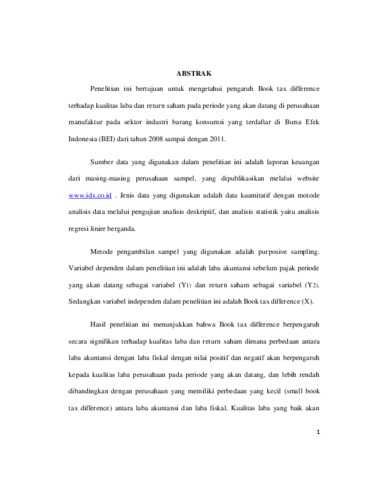 Penelitian ini bertujuan untuk mengetahui pengaruh Book tax difference terhadap kualitas laba dan return saham pada periode yang akan datang di perusahaan manufaktur pada sektor industri barang konsumsi yang terdaftar di Bursa Efek Indonesia (BEI) dari tahun 2008 sampai dengan 2011. Sumber data yang digunakan dalam penelitian ini adalah laporan keuangan dari masing-masing perusahaan sampel, yang dipublikasikan melalui website www.idx.co.id . Jenis data yang digunakan adalah data kuantitatif dengan motode analisis data melalui pengujian analisis deskriptif, dan analisis statistik yaitu analisis regresi linier berganda. Metode pengambilan sampel yang digunakan adalah purposive sampling. Variabel dependen dalam penelitian ini adalah laba akuntansi sebelum pajak periode yang akan datang sebagai variabel (Y1) dan return saham sebagai variabel (Y2). Sedangkan variabel independen dalam penelitian ini adalah Book tax difference (X). Hasil penelitian ini menunjukkan bahwa Book tax difference berpengaruh secara signifikan terhadap kualitas laba dan return saham dimana perbedaan antara laba akuntansi dengan laba fiskal dengan nilai positif dan negatif akan berpengaruh kepada kualitas laba perusahaan pada periode yang akan datang, dan lebih rendah dibandingkan dengan perusahaan yang memiliki perbedaan yang kecil (small book tax difference) antara laba akuntansi dan laba fiskal. Kualitas laba yang baik akan berpengaruh terhadap respon dari investor dalam memperhitungkan return saham yang ingin di capai pada periode yang akan datang.