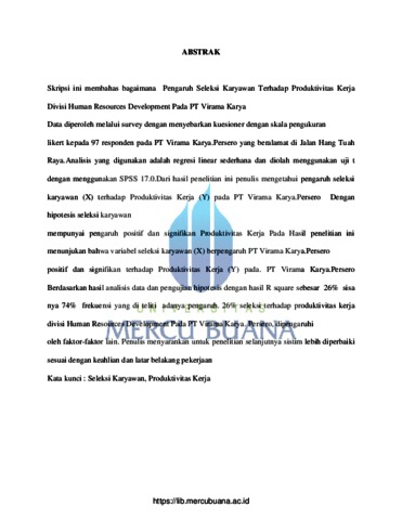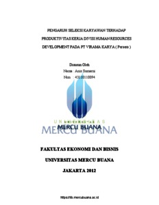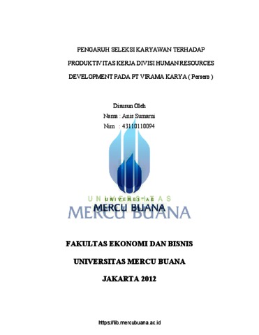 SUMARNI, ANIS (2012) PENGARUH SELEKSI KARYAWAN TERHADAP PRODUKTIVITAS KERJA DIVISI HUMAN RESOURCES DEVELOPMENT PADA PT VIRAMA KARYA ( Persero ). S1 thesis, Universitas Mercu Buana Jakarta.