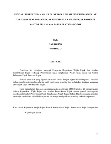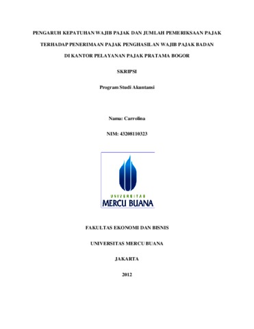 CARROLINA, CARROLINA (2012) PENGARUH KEPATUHAN WAJIB PAJAK DAN JUMLAH PEMERIKSAAN PAJAK TERHADAP PENERIMAAN PAJAK PENGHASILAN WAJIB PAJAK BADAN DI KANTOR PELAYANAN PAJAK PRATAMA BOGOR. S1 thesis, Universitas Mercu Buana Jakarta.