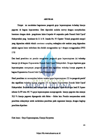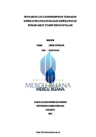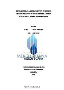 FITRIANI, DEDE (2012) PENGARUH GAYA KEPEMIMPINAN TERHADAP KINERJA PEGAWAI DI BAGIAN KEPERAWATAN RUMAH SAKIT SYARIF HIDAYATULLAH. S1 thesis, Universitas Mercu Buana Jakarta.