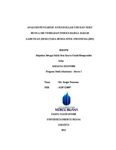 PURNAMA, RD. SOEGIA (2012) ANALISIS PENGARUH KURS DOLLAR USD DAN SUKU BUNGA SBI TERHADAP INDEKS HARGA SAHAM GABUNGAN (IHSG) PADA BURSA EFEK INDONESIA (BEI). S1 thesis, Universitas Mercu Buana Jakarta.