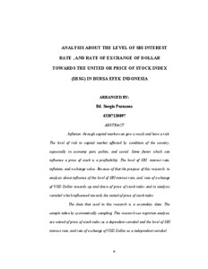 lation through capital market can give a result and have a risk. The level of risk in capital market affected by condition of the country, espescially in economy part, politic, and social. Some factor which can influence a price of stock is a profitability. The level of SBI interest rate, inflation, and exchange value. Because of that the purpose of this research to analysis about influence of the level of SBI interest rate, and rate of exchange of USD Dollar towards up and down of price of stock index and to analysis variabel which influenced towards the united of price of stock index The data that used in this research is a secondary data. The sample taken by systematically sampling. This research use regretion analysis are united of price of stock index as a dependent variabel and the level of SBI interest rate, and rate of exchange of USD Dollar as a independent variabel. v The result of research of regretion analysis is 41 % variabel of the level of SBI interest rate, and rate of exchange of USD Dollar towardsIHSG. It means that the simultang of the level of inflation, SBI interest rate, and rate of exchange of USD Dollar influenced towards the united of price of stock index. The level of inflation nd rate of exchange of USD Dollar positive influenced towards the united of price of stock index, whereas the level of SBI interest rate negative influenced towards the united opf price of stock index. And three of independent variabel, the level of SBI interest rate is a variabel which have dominant influenced towards the united of price of stock index.