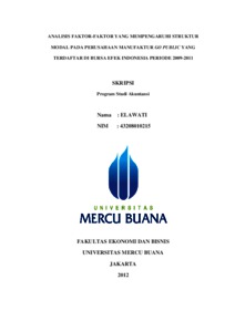 ELAWATI, ELAWATI (2012) ANALISA FAKTOR FAKTOR YANG MEMPENGARUHI STRUKTUR MODAL PADA PERUSAHAAN MANUFAKTUR GO PUBLIC YANG TERDAFTAR DI BURSA EFEK INDONESIA PERIODE 2009-2011. S1 thesis, Universitas Mercu Buana Jakarta.