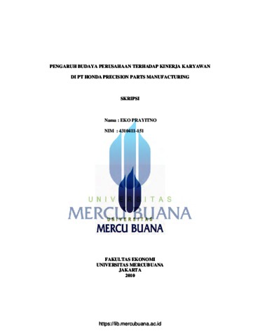 Prayitno, Eko (2010) PENGARUH BUDAYA PERUSAHAAN TERHADAP KINERJA KARYAWAN DI PT. HONDA PARTS MANUFACTURING. S1 thesis, Universitas Mercu Buana.