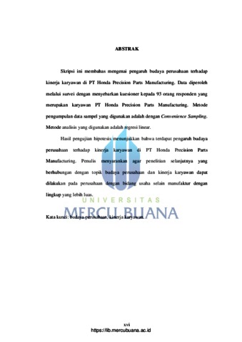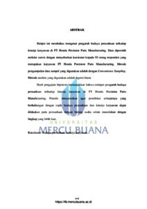 Skripsi ini membahas mengenai pengaruh budaya perusahaan terhadap kinerja karyawan di PT Honda Precision Parts Manufacturing. Data diperoleh melalui survei dengan menyebarkan kuesioner kepada 93 orang responden yang merupakan karyawan PT Honda Precision Parts Manufacturing. Metode pengumpulan data sampel yang digunakan adalah dengan Convenience Sampling. Metode analisis yang digunakan adalah regresi linear. Hasil pengujian hipotesis menunjukkan bahwa terdapat pengaruh budaya perusahaan terhadap kinerja karyawan di PT Honda Precision Parts Manufacturing. Penulis menyarankan agar penelitian selanjutnya yang berhubungan dengan topik budaya perusahaan dan kinerja karyawan dapat dilakukan pada perusahaan dengan bidang usaha selain manufaktur dengan lingkup yang lebih luas. Kata kunci: budaya perusahaan, kinerja karyawan