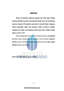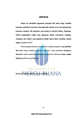 Skripsi ini membahas bagaimana pengaruh dari brand iamge terhadap keputusan pembelian konsumen. Data diperoleh melalui survey dan menyebarkan kuesioner sebanyak 100 responden yang berada di wilayah Ciledug, Tangerang. Teknik pengambilan sampel yang digunakan adalah convenience sampling, sedangkan alat analisis yang digunakan adalah regresi linear sederhana dengan tingkat signifikan 0,05%. Hasil pengujian hipotesis menunjukkan terdapat pengaruh yang signifikan dari brand image terhadap keputusan pembelian. Untuk penelitian selanjutnya disarankan untuk melakukan penelitian pada organisasi selain perusahaan, dengan lingkup penelitian yang lebih luas. Kata kunci : brand image, keputusan pembelian.