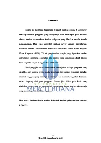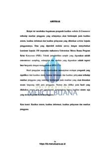 Skripsi ini membahas bagaimana pengaruh kualitas website E-Commerce terhadap manfaat pengguna yang selanjutnya akan berdampak pada kualitas sistem, kualitas informasi dan kualitas pelayanan yang diberikan website kepada penggunannya. Data yang diperoleh melalui survey dengan menyebarkan kuesioner kepada 150 responden mahasiswa Universitas Mercu Buana Program Kelas Karyawan (PKK). Teknik pengambilan sample yang digunakan adalah convenience sampling, sedangkan alat analisis yang digunakan adalah regresi liner berganda dengan menggunakan SPSS 17.0. Hasil pengujian secara keseluruhan menunjukan terdapat pengaruh yang signifikan dari kualitas sitem, kuaitas informasi, dan kualitas pelayanan terhadap manfaat pengguna yang nantinya berdampak pada manfaat yang akan dirasakan secara langsung oleh para pengguna. Namun jika dilihat pada hasil yang dilakukan secara satu per satu/parsial, menunjukan hanya kualitas sistem saja yang mempengaruhi manfaat pengguna. Kata kunci: Kualitas sistem, kualitas informasi, kualitas pelayanan dan manfaat pengguna.