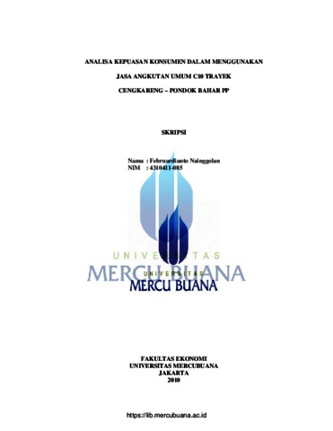 Nainggolan, Februardianto (2010) ANALISA KEPUASAN KONSUMEN DALAM MENGGUNAKAN JASA ANGKUTAN UMUM C10 TRAYEK CENGKARENG - PONDOK BAHAR PP. S1 thesis, Universitas Mercu Buana.