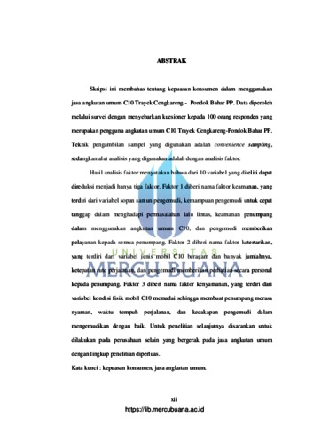 Skripsi ini membahas tentang kepuasan konsumen dalam menggunakan jasa angkutan umum C10 Trayek Cengkareng - Pondok Bahar PP. Data diperoleh melalui survei dengan menyebarkan kuesioner kepada 100 orang responden yang merupakan pengguna angkutan umum C10 Trayek Cengkareng-Pondok Bahar PP. Teknik pengambilan sampel yang digunakan adalah convenience sampling, sedangkan alat analisis yang digunakan adalah dengan analisis faktor. Hasil analisis faktor menyatakan bahwa dari 10 variabel yang diteliti dapat direduksi menjadi hanya tiga faktor. Faktor 1 diberi nama faktor keamanan, yang terdiri dari variabel sopan santun pengemudi, kemampuan pengemudi untuk cepat tanggap dalam menghadapi permasalahan lalu lintas, keamanan penumpang dalam menggunakan angkutan umum C10, dan pengemudi memberikan pelayanan kepada semua penumpang. Faktor 2 diberi nama faktor ketertarikan, yang terdiri dari variabel jenis mobil C10 beragam dan banyak jumlahnya, ketepatan rute perjalanan, dan pengemudi memberikan perhatian secara personal kepada penumpang. Faktor 3 diberi nama faktor kenyamanan, yang terdiri dari variabel kondisi fisik mobil C10 memadai sehingga membuat penumpang merasa nyaman, waktu tempuh perjalanan, dan kecakapan pengemudi dalam mengemudikan dengan baik. Untuk penelitian selanjutnya disarankan untuk dilakukan pada perusahaan selain yang bergerak pada jasa angkutan umum dengan lingkup penelitian diperluas. Kata kunci : kepuasan konsumen, jasa angkutan umum.