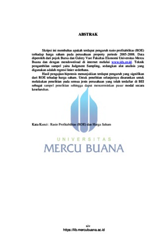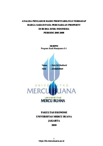 Budiarti, Euis Sri (2010) ANALISA PENGARUH RASIO PROFITABILITAS TERHADAP HARGA SAHAM PADA PERUSAHAAN PROPERTY DI BURSA EFEK INDONESIA PERIODE 2005 - 2008. S1 thesis, Universitas Mercu Buana.