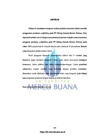 Skripsi ini membahas mengenai analisa perilaku konsumen dalam memilih penggunaan peralatan scaffolding pada PT Gilang Gemala Borneo Perkasa. Data diperoleh melalui survei dengan menyebarkan kuesioner kepada semua konsumen pengguna peralatan scaffolding pada PT Gilang Gemala Borneo Perkasa pada tahun 2009 yang berada di wilayah Jakarta yaitu sebanyak 35 perusahaan. Metode yang digunakan adalah analisis faktor. Hasil pengujian hipotesis menunjukkan bahwa dari 9 variabel yang dianalisis dapat direduksi menjadi 3 faktor yaitu faktor kesesuaian keinginan konsumen, faktor pilihan, dan faktor kompetisi/persaingan. Untuk penelitian selanjutnya seputar variabel yang berkaitan dengan perilaku konsumen, disarankan untuk dilakukan pada perusahaan selain yang bergerak pada bidang jasa pengadaan peralatan dengan lingkup penelitian diperluas. Kata kunci: perilaku konsumen, jasa.