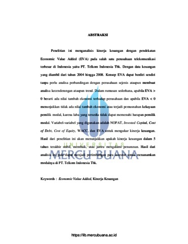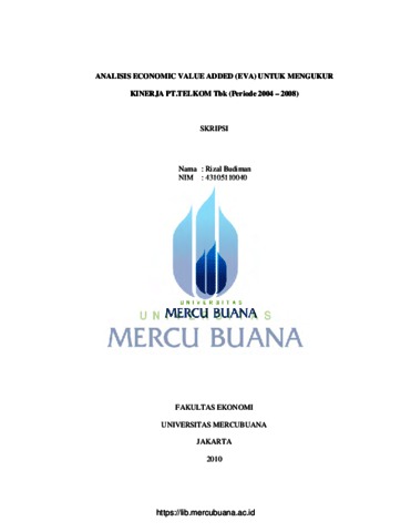 Budiman, Rizal (2010) ANALISIS ECONOMIC VALUE ADDED (EVA) UNTUK MENGUKUR KINERJA PT. TELKOM TBK (periode 2004 - 2008). S1 thesis, Universitas Mercu Buana.