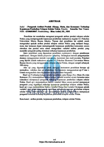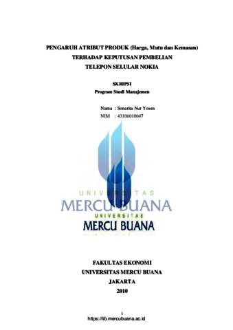 Yosen, Sonarita Nur (2010) PENGARUH ATRIBUT PRODUK (Harga, Mutu dan Kemasan) TERHADAP KEPUTUSAN PEMBELIAN TELEPON SELULAR NOKIA. S1 thesis, Universitas Mercu Buana.