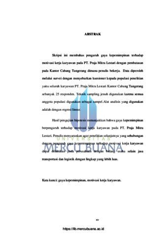 Skripsi ini membahas pengaruh gaya kepemimpinan terhadap motivasi kerja karyawan pada PT. Praja Mitra Lestari dengan pembatasan pada Kantor Cabang Tangerang dimana penulis bekerja. Data diperoleh melalui survei dengan menyebarkan kuesioner kepada populasi penelitian yaitu seluruh karyawan PT. Praja Mitra Lestari Kantor Cabang Tangerang sebanyak 25 responden. Teknik sampling jenuh digunakan karena semua anggota populasi digunakan sebagai sampel.Alat analisis yang digunakan adalah dengan regresi linear. Hasil pengujian hipotesis menunjukkan bahwa gaya kepemimpinan berpengaruh terhadap motivasi kerja karyawan pada PT. Praja Mitra Lestari. Penulis menyarankan agar penelitian selanjutnya yang sehubungan dengan pengaruh gaya kepemimpinan terhadap motivasi kerja karyawan dapat dilakukan pada perusahaan dengan bidang usaha selain jasa transportasi dan logistik dengan lingkup yang lebih luas. Kata kunci: gaya kepemimpinan, motivasi kerja karyawan.