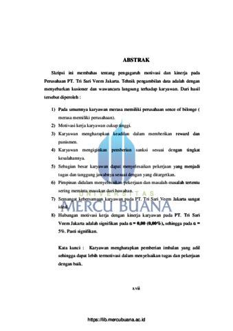 Skripsi ini membahas tentang pengagaruh motivasi dan kinerja pada Perusahaan PT. Tri Sari Veem Jakarta. Tehnik pengambilan data adalah dengan menyebarkan kusioner dan wawancara langsung terhadap karyawan. Dari hasil tersebut diperoleh : 1) Pada umumnya karyawan merasa memiliki perusahaan sence of bilonge ( merasa memiliki perusahaan). 2) Motivasi kerja karyawan cukup tinggi. 3) Karyawan mengharapkan keadilan dalam memberikan reward dan panismen. 4) Karyawan mengiginkan pemberian sanksi sesuai dengan tingkat kesalahannya. 5) Sebagian besar karyawan dapat menyelesaikan pekerjaan yang menjadi tugas dan tanggung jawabnya sesuai dengan yang ditargetkan. 6) Pimpinan didalam menyelesaikan pekerjaan dan masalah-masalah tertentu sering meminta masukan dari bawahan. 7) Semangat kebersamaan karyawan pada PT. Tri Sari Veem Jakarta sangat ideal. 8) Hubungan motivasi kerja dengan kinerja karyawan pada PT. Tri Sari Veem Jakarta adalah signifikan pada α = 0,00 (0,00%), sehingga pada α = 5%. Pasti signifikan. Kata kunci : Karyawan mengharapkan pemberian imbalan yang adil sehingga dapat lebih termotivasi dalam menyelsaikan tugas dan pekerjaan dengan baik.