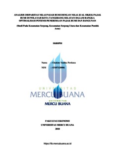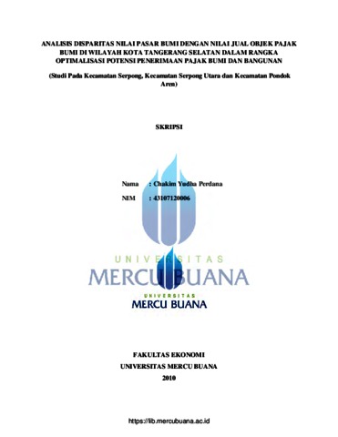 Perdana, Chakim Yudha (2010) ANALISIS DISPARITAS NILAI PASAR BUMI DENGAN NILAI JUAL OBJEK PAJAK BUMI DI WILAYAH KOTA TANGGERANG SELATAN DALAM RANGKA OPTIMALISASI POTENSI PENERIMAAN PAJAK BUMI DAN BANGUNAN (Studi pada kecamatan Serpong Utara dan Kecamatan Pondok Aren). S1 thesis, Universitas Mercu Buana.