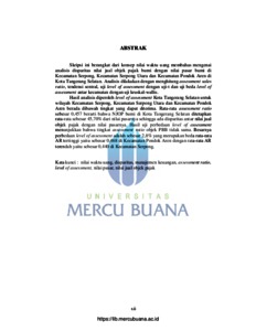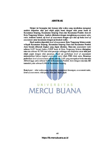 Skripsi ini berangkat dari konsep nilai waktu uang membahas mengenai analisis disparitas nilai jual objek pajak bumi dengan nilai pasar bumi di Kecamatan Serpong, Kecamatan Serpong Utara dan Kecamatan Pondok Aren di Kota Tangerang Selatan. Analisis dilakukan dengan menghitung assessment sales ratio, tendensi sentral, uji level of assessment dengan uji-t dan uji beda level of assessment antar kecamatan dengan uji kruskal-wallis. Hasil analisis diperoleh level of assessment Kota Tangerang Selatan untuk wilayah Kecamatan Serpong, Kecamatan Serpong Utara dan Kecamatan Pondok Aren berada dibawah tingkat yang dapat diterima. Rata-rata assessment ratio sebesar 0,457 berarti bahwa NJOP bumi di Kota Tangerang Selatan ditetapkan rata-rata sebesar 45,70% dari nilai pasarnya sehingga ada disparitas antar nilai jual objek pajak dengan nilai pasarnya. Hasil uji perbedaan level of assessment menunjukkan bahwa tingkat assessment ratio objek PBB tidak sama. Besarnya perbedaan level of assessment adalah sebesar 2,8% yang merupakan beda rata-rata AR tertinggi yaitu sebesar 0,468 di Kecamatan Pondok Aren dengan rata-rata AR terendah yaitu sebesar 0,440 di Kecamatan Serpong. Kata kunci : nilai waktu uang, disparitas, manajemen keuangan, assessment ratio, level of assessment, nilai pasar, nilai jual objek pajak