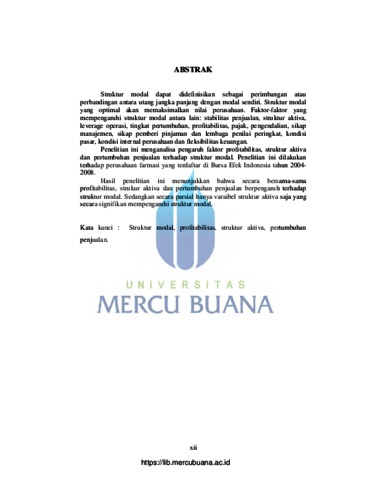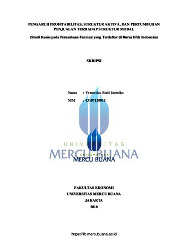 Jatmiko, Venantius Budi (2010) PENGARUH PROFITABILITAS, STRUKTUR AKTIVA, DAN PERTUMBUHAN PENJUALAN TERHADAP STRUKTUR MODAL (Studi Kasus pada Perusahaan Farmasi yang terdaftar di Bursa Efek Indonesia). S1 thesis, Universitas Mercu Buana.