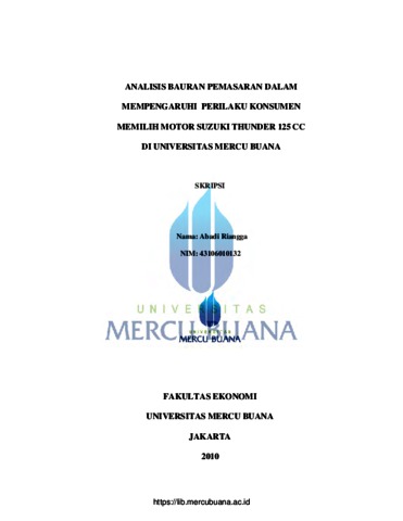 Riangga, Abadi (2010) ANALISIS BAURAN PEMASARAN DALAM MEMPENGARUHI PERILAKU KONSUMEN MEMILIH MOTOR SUZUKI THUNDER 125 CC DI UNIVERSITAS MERCU BUANA. S1 thesis, Universitas Mercu Buana.