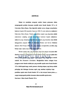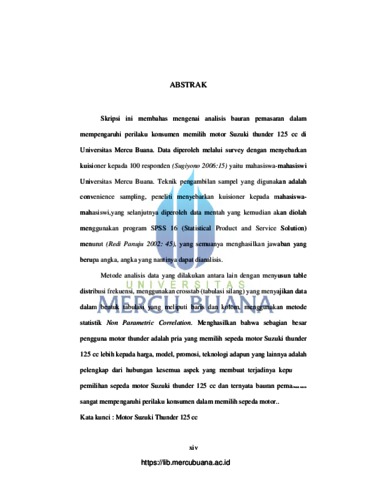 Skripsi ini membahas mengenai analisis bauran pemasaran dalam mempengaruhi perilaku konsumen memilih motor Suzuki thunder 125 cc di Universitas Mercu Buana. Data diperoleh melalui survey dengan menyebarkan kuisioner kepada 100 responden (Sugiyono 2006:15) yaitu mahasiswa-mahasiswi Universitas Mercu Buana. Teknik pengambilan sampel yang digunakan adalah convenience sampling, peneliti menyebarkan kuisioner kepada mahasiswamahasiswi,yang selanjutnya diperoleh data mentah yang kemudian akan diolah menggunakan program SPSS 16 (Statistical Product and Service Solution) menurut (Redi Panuju 2002: 45), yang semuanya menghasilkan jawaban yang berupa angka, angka yang nantinya dapat dianalisis. Metode analisis data yang dilakukan antara lain dengan menyusun table distribusi frekuensi, menggunakan crosstab (tabulasi silang) yang menyajikan data dalam bentuk tabulasi yang meliputi baris dan kolom, menggunakan metode statistik Non Parametric Correlation. Menghasilkan bahwa sebagian besar pengguna motor thunder adalah pria yang memilih sepeda motor Suzuki thunder 125 cc lebih kepada harga, model, promosi, teknologi adapun yang lainnya adalah pelengkap dari hubungan kesemua aspek yang membuat terjadinya keputusan pemilihan sepeda motor Suzuki thunder 125 cc dan ternyata bauran pemasaran sangat mempengaruhi perilaku konsumen dalam memilih sepeda motor.. Kata kunci : Motor Suzuki Thunder 125 cc