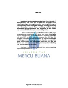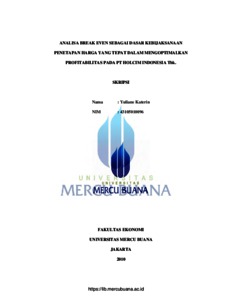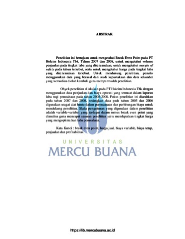 Katerin, Yuliane (2010) ANALISA BREAK EVEN SEBAGAI DASAR KEBIJAKSANAAN PENETAPAN HARGA YANG TEPAT DALAM MENGOPTIMALKAN PROFITABILITAS PADA PT. HOLCIM INDONESIA TBK. S1 thesis, Universitas Mercu Buana.