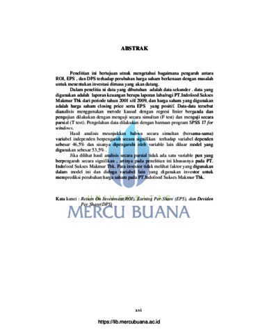Hartinah, Sri (2010) PENGARUH RETURN ON INVESTMENT (ROI), EARNING PER SHARE (EPS) DAN DEVIDENT PER SHARE (DPS) TERHADAP HARGA SAHAM PADA PT. INDOFOOD SUKSES MAKMUR TBK. S1 thesis, Universitas Mercu Buana.
