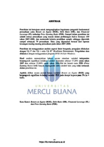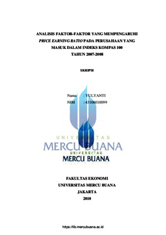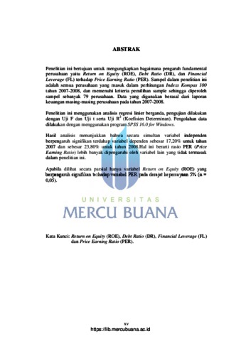 Yulyanti, Yulyanti (2010) ANALISIS FAKTOR - FAKTOR YANG MEMPENGARUHI PRICE EARNING RATIO PADA PERUSAHAAN YANG MASUK DALAM INDEKS KOMPAS 100 TAHUN 2007 - 2008. S1 thesis, Universitas Mercu Buana.